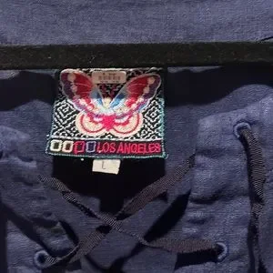 Women’s size L. Navy top. Measurement’s when laid flat are bust 24”, waist 24”, sleeves 10”, and overall length 27”.