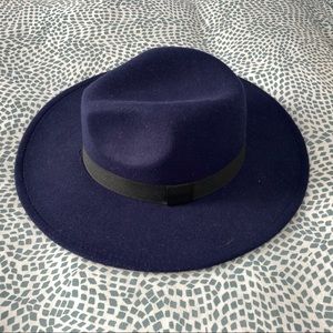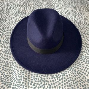 Unbranded Navy Blue wide brim felt fedora with black ribbon trim. Hat is inflexible. 2nd and 3rd photo are most color accurate.