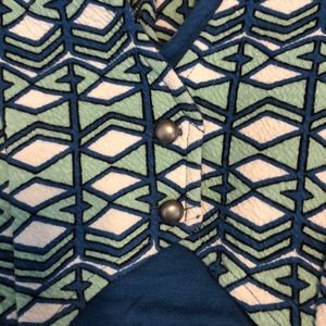 New! Textured double-V neck sleeveless dress. Fit and flare style. Blue, teal and white geometric motif pattern. Button back with cut out. Knee Length. 70% Cotton 28% Polyester 2% Spandex. Size 2. Measures approximately 14” armpit to armpit and length.