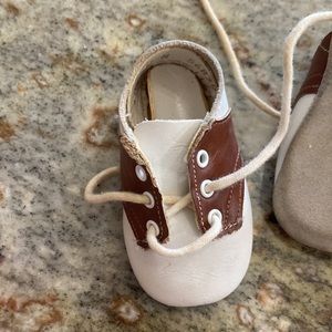 Newborn Antique Baby Deere crib shoes. They are dark brown and white. In very good condition
