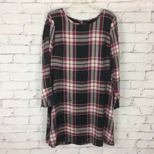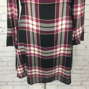 Ann Taylor Loft Women’s black/plum plaid A-line dress with long bell sleeves and zip/tie back. Size 12.