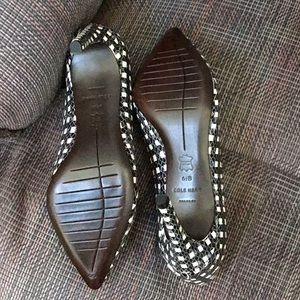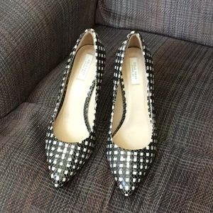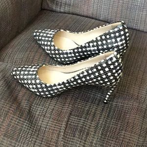 Unworn, no box. Size 6.5. Leather. Not fabric. Heels are approximately 3.5 inches tall.