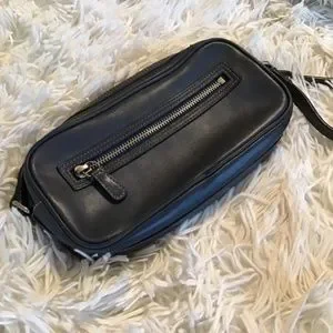 Measurements: 9” wide and 4” high. The strap length reaches about 22” at its furthest and 18” at its shortest. This is before cross bodies so it was originally meant to be worn as a mini bag. It’s just so perfectly casual. Fits cell, lip glass, mascara, and wallet. Some wear on the edge of the strap and one area of the piping as noted in pics. Otherwise it’s in fabulous vintage condition. Small baguette shape