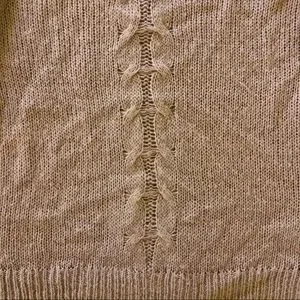 Pretty v-neck sweater in fawn. Cable knit detail down front and back amd sleeves. Super pretty. Worn once. Please note there is a tiny difference in the weave on upper left side by neck. It came like that. Smoke free home.