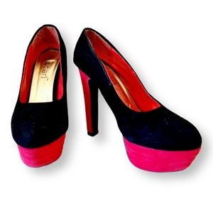 Y2k, super unique black felt heels with red platform heels and gold inner sole.