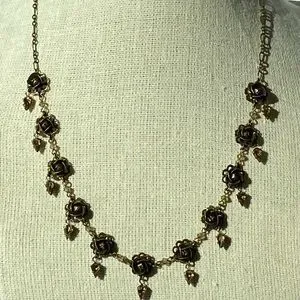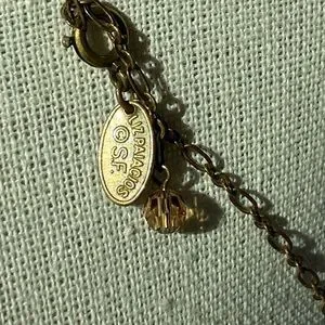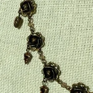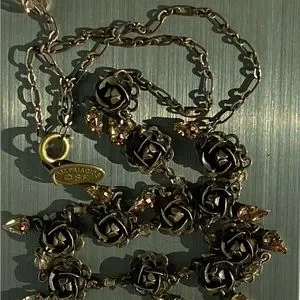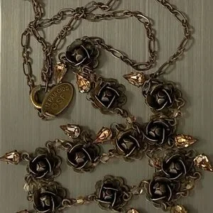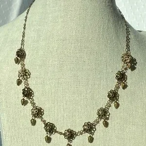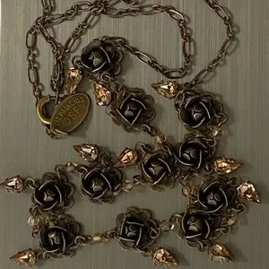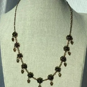 A gently used signed designer Liz Palacios bronze metal flower choker necklace with pear-shaped light amber color crystals. Has a signed oval tag stamped LIZ PALACIOS S.F. with the copyright symbol next to a spring clasp in good working condition. Measures 17" in length and comes clean and lightly polished. This is a choker necklace and may appear larger in the images because the jewelry holder is small in size and some images are zoom-in for your viewing. Thanks!