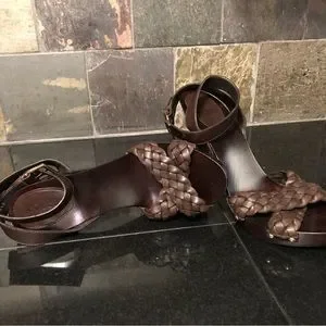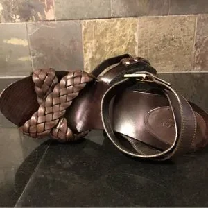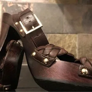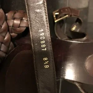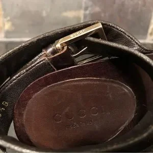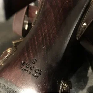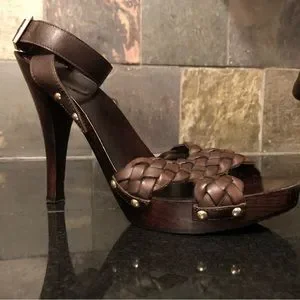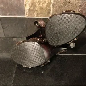 5” heel overall, achieved with just shy of a 1” platform. Rich deep brown (I’d say mahogany or chocolate in color). Italian leather braided criss crossing the open toes, then smooth leather straps criss cross and wrap your ankles and the gleaming gold tone / brass buckle adorned with the GUCCI logo embossed on them. Additional contrast is achieved by the metallic studs along the sides fastening all the straps. Dark brown stained sexy tapered heels and platform. No slip grip has the classic repeating double G logo for sure footing.
