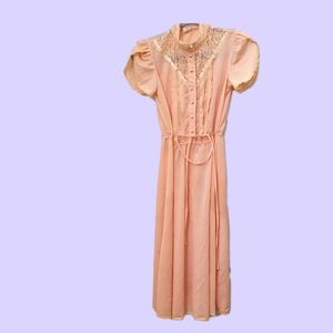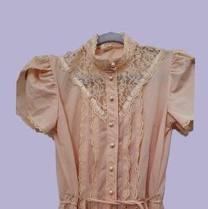 Lovely peach dress with high collar and puff sleeves with lace and pearl details. This is the same dress as featured by Free People