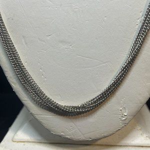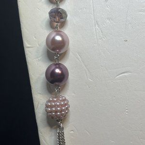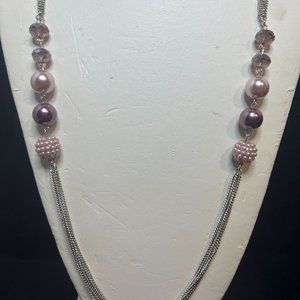 Roman 5 Strand Silver Tone Curb Chain Necklace With Pink And Purple Beads. It has a metal tag that is signed RMN.