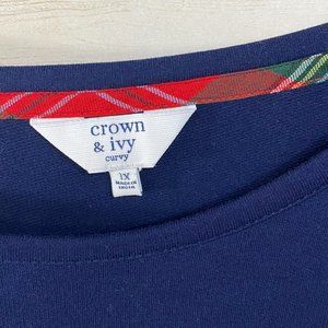 Navy in color with ruffle trim with colors of red, green, blue, yellow and white