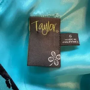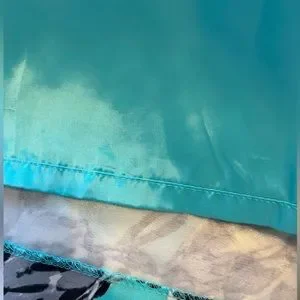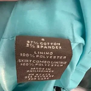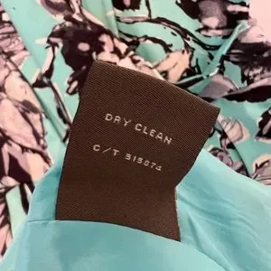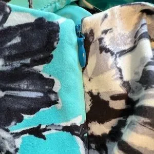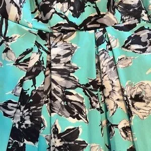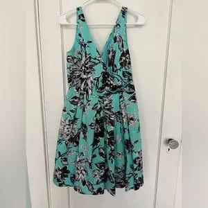 A-line dress, robins egg blue with black and white watercolor flower print, bodice cotton/spandex, flattering pleat, small stain see last photo