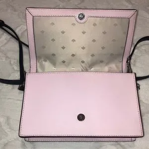 Material: Saffiao two way leather with kate spade jacquard lining. Metal pinmount logo. Flap and magnetic snap closure. Interior slip pocket. Exterior back slip pocket.