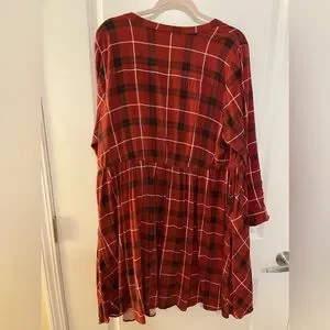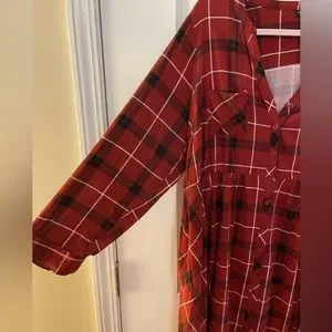 Size to Torrid red/black/white plaid dress with functional buttons. Fabric is smooth with some stretch. Long sleeves with built-in or button tabs to hold them up if you wish to roll them. Super cute for Christmas. Slight small area of discoloration on front chest area, not really noticeable while wearing but please check pictures.
