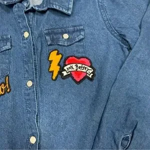 🏷️ Betsey Johnson Denim Patches Button Down Shirt 10