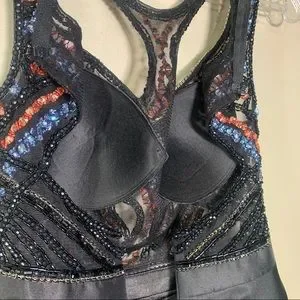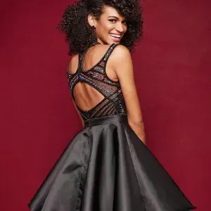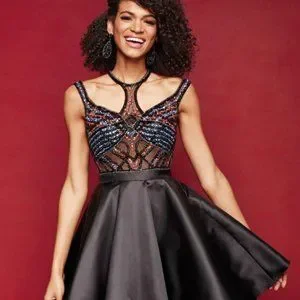 Short beaded dress with sheer mesh and a Mikado a-line skirt. Brand new with tags, comes with dress bag. Homecoming, prom, pageant, formal gala event.