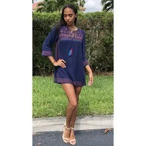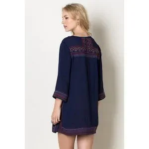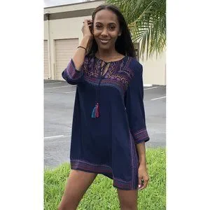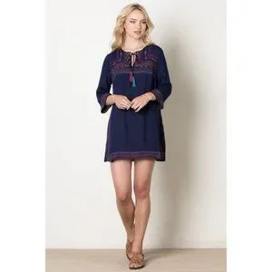 It features split V-neckline with tassel ties, 3/4 sleeves, colorful embroidery on a navy background and has an A-line mini silhouette