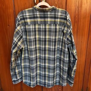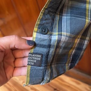 Columbia men’s Long sleeve casual button up shirt. Vintage. Green and yellow plaid pattern. Extra buttons. No stains or tears. Nice shirt!