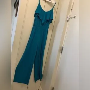 Blue V neck with ruffles and tiny straps jumpsuit.
