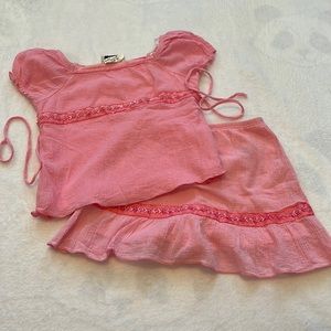 Size 6X IZ Byer California pink, beaded skort outfit. Top ties in back, skirt with knit shorts underneath. Beaded top and bottom. In excellent used condition.