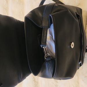 Very nice little backpack. Two pockets zipper closure outside. Flap magnet closure. One department with clasp closure inside. Two more pockets inside- no zip.
