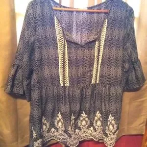 This is a gorgeous oversized tunic. Embroidery embellished and tie up v-neck with three quarter inch Bell sleeves. This is a Maurice's size small but looks like it might also fit a medium. Throw this on with a pair of black slacks or denim and you are ready for any occasion!