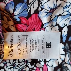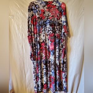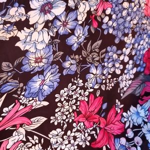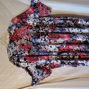 Ulla Popken beautiful multi colored Floral dress. Short sleeve with round neckline. Has gathered Empire waist and side seam pockets. A-line swing shape. Feels like Jersey, soft, stretchy and slinky.