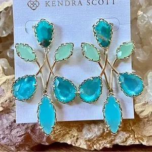 With a curated color mix & teardrop silhouettes, the gorgeous Gwyneth Statement Earrings in the ocean-inspired Aqua Mix are a tribute to early Kendra Scott designs. Incredibly striking & versatile, these stunning crystal statement earrings will shine like a chandelier & light up every room. No matter what the occasion, theyβll be your favorite go-to pair whenever you want to stand out. Approximately 2.5β long, 1.4β wide. Made with genuine turquoise colored magnesite, chalcedony crystals, 14K gold plated over brass & post backs. NWT π·