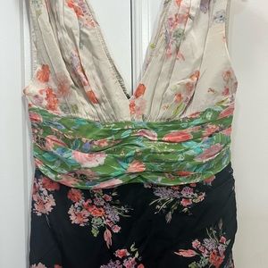 Multicolored floral printed silk (100% Silk). Hourglass. Sleeveless. V-neckline. Hidden back zipper closure. 46" from shoulder to hemline. Imported.
