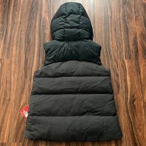 Warm 700 down fill power vest with adjustable hood in gray. Waterprof hood and shoulder area, zippered side pockets with fleece lining, inner zipperd chest pocket.