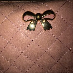 This pink quilted pattern bag has a a gold bow embellishment on the front and a gold strap that is removable so it can be worn as a shoulder purse or carried as a makeup/cosmetics bag. The first couple photos were taken in natural lighting and are a better representation of the true color of the bag.