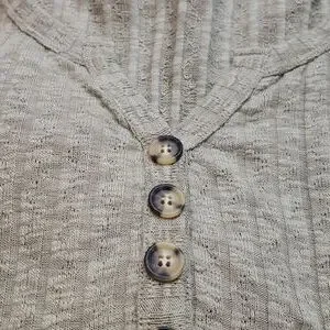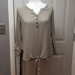 Pre-owned, great condition! maurices v neck top with 4 buttons and cute tie front. both sleeves are cinched. olive color. size xl.