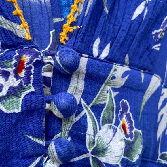 This dress has some small irregularities shown in the pic and at the end of the video. There are a few small stitches loose and the fabric on the buttons is thinner than on other dresses. This does not harm the integrity or beauty of this dress!
