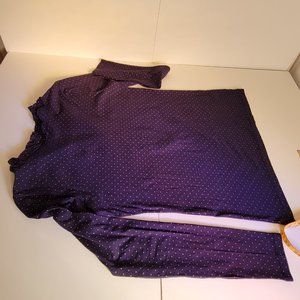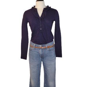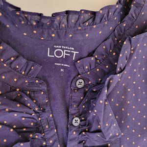 LOFT Navy Poka Dot Ruffle Neck LS Top, Size M, NWOT