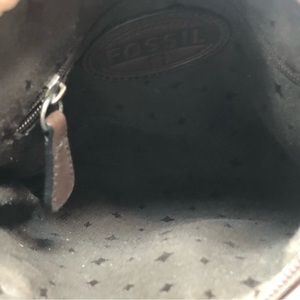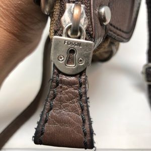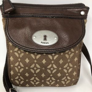 Brown and tan crossbody bag with adjustable strap to convert bag to shoulder bag. Missing Fossil key charm. Has wear but still in good condition.