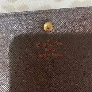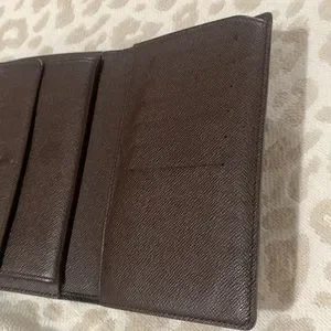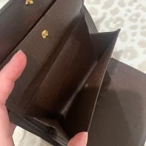 Authentic Damier Ebene Alexandra Wallet in very good condition. The glazing on the edges has no signs of wear except one very small spot on the left bottom edge as shown on the picture. Slight tarnish on outer snap, and an indention on inner flap as shown in the video above. Canvas and leather look great, and wallet is very clean. Does not come with anything except the wallet itself. No odors, stains, or sticky spots (feels like new). Canvas is in perfect condition.