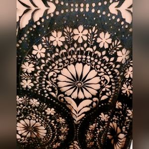 Anthropologie Farm Rio black, floral, long sleeve burnout midi dress with open back.