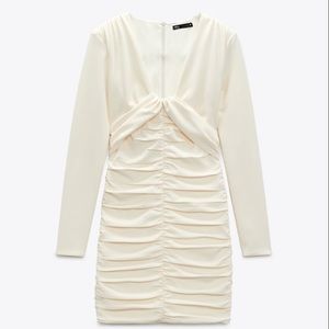 Short V-neck dress with long sleeves and shoulder pads. Draped