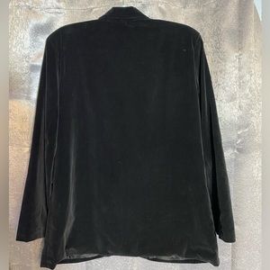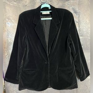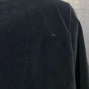 Gorgeous vintage solid black cotton velvet blazer has single-button closure. Two front hip pockets.Fully lined. Very good condition. Machine washable in cold water on gentle cycle & line dry or DRY CLEAN only. I washed this item & hung it to dry. It’s ready-to-wear!!