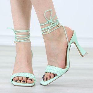 Mint Open Toe High Heel Sandals Ankle Strap Lace Ties Braded Toe Strap Heel