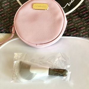 Approx measurements: 5.5” round diameter metallic pink bag with 5” zipper pull with clear pink acrylic ball detail, 1” deep. Shiny gold MAC logo with protective seal intact.