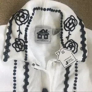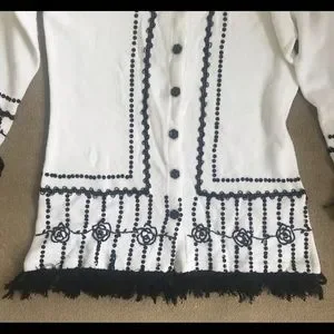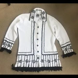 This is a unique sweater that is new from a smoke free home. It has sequined accents and fringe on the bottom and at the bottom of the sleeves. It is 50% Ramie and 45% cotton. it is medium to heavy weight. Ask if measurements are needed.