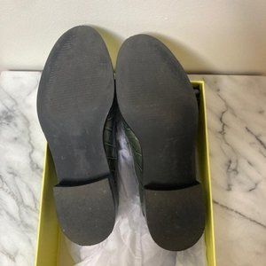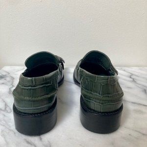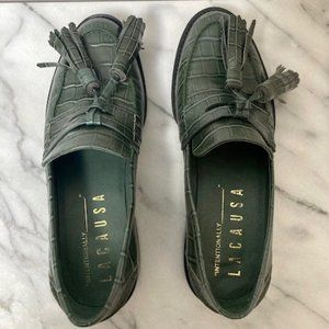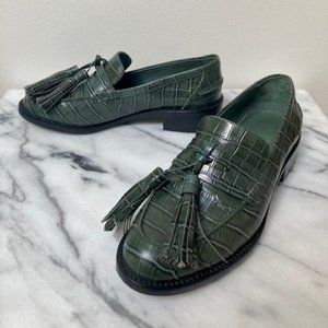 These sold out, dark green croc leather loafers with removable tassels are an Intentionally Blank collaboration with Lacausa from Spring 2022. They are like-new: Worn only once to an office. Very minor wear visible on bottom of soles, shown in photo, but otherwise in perfect condition.