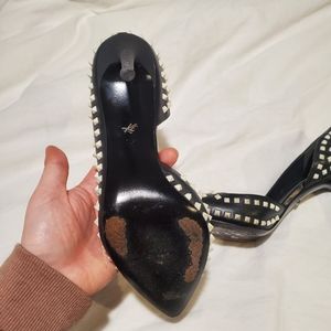 Barely worn. Uppers are extremely good condition, all spikes intact! no scuffs on tops - only real wear is on bottoms, some scuffing. matte black leather with pure white spikes - online stock photos show best color. amazing black and white bright contrast! half d'orsay style. approximately 4 inch heel. pointed toe. iconic shoes that will get plenty of compliments!