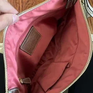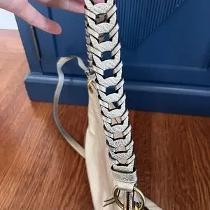 Coach handbag in metallic gold finish. Comes with braided top strap, and longer strap for crossbody wear. Clean interior with lots of interior pockets. Two outside pockets with magnetic snap closure.