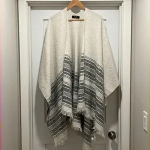 Cozy wrap, can double as a lap blanket. Nubby cream color fabric with grey stripes and fringe at the bottom. Measures approx 36” in length