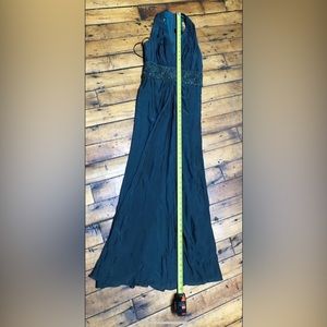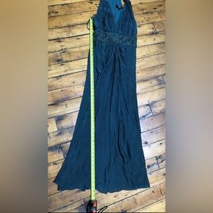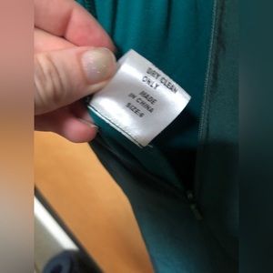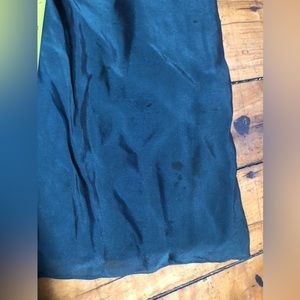 In good condition, a couple of small dark spots at base of dress. Haven’t tried to treat them. See photos for length. 58” from top of zipper, 48” from base of armpit. Dark emerald green