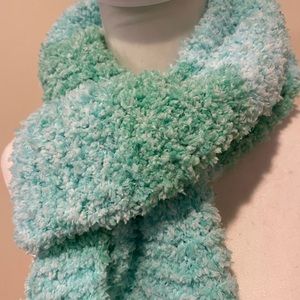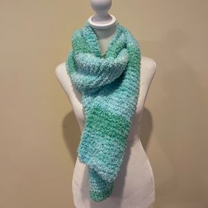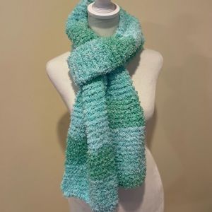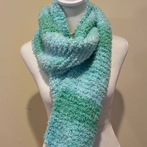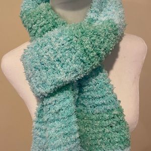 Handmade scarf in gorgeous aqua shades. Super soft and fluffy. Approx 72”x8”. Add some beautiful color to your winter warmth.