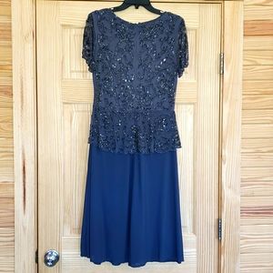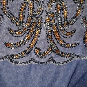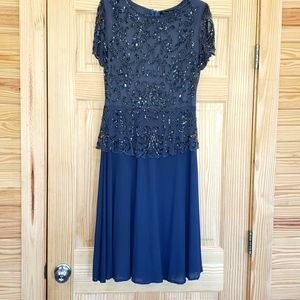 Pizarro Nights, size 10, hemmed to be short length, zipper in back. Beautiful sequins and beading. Blue/grey color. Approximately 44 inches from shoulder to hem.