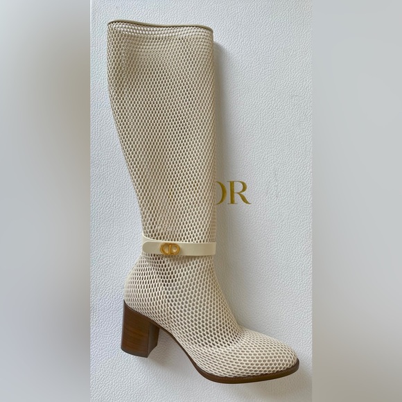 Dior Empreinte Montaigne 70 mm Off White Knee High Pull On Caged Boots 38.5