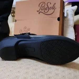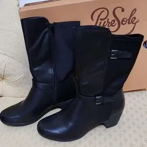 Pure Sole soft black leather mid calf boot with soft stretch back. Like new with box, very comfortable, side zip, two brushed silver buckle detailing, 2in soft rubber heel, non slip sole. shaft 10" calf circumference 14"